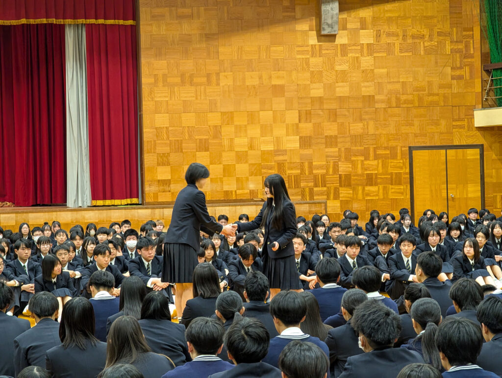 2026/04/21 Tue 行事 対面式・部活動紹介 4月9日(木)、対面式と部紹介が行われました。対面式では、在校生代表が歓迎の言葉を述べ、新入生代表が学校生活の抱負を述べました。その後、部紹介が行われ、各部活動の代表者が部活動の内容を説明しました。実際に練習風景を見せるなど工夫を凝らした紹介となり、1年生は静かに、また真剣な面持ちでその様子を見ていました。この日以降見学・体験を行い、21日部結成となります。